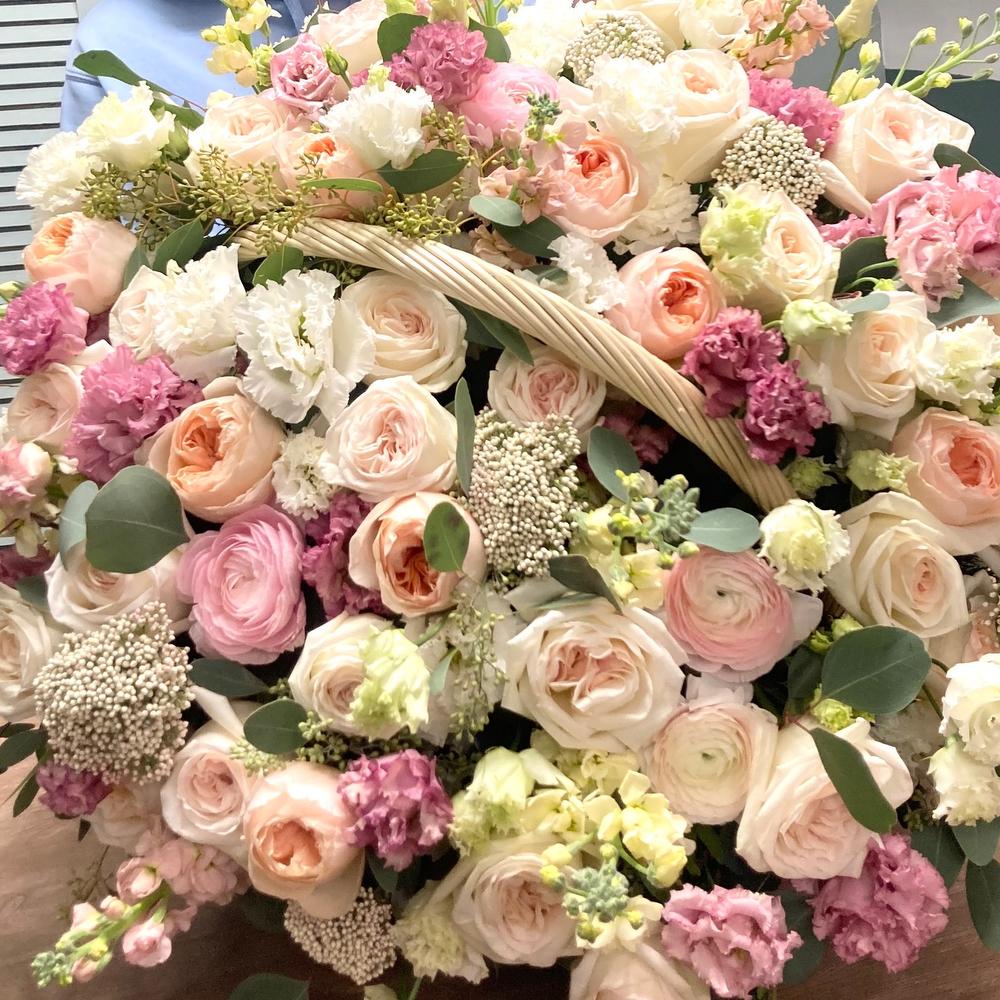 Роскошная корзина с ранункулюсами, английскими пионовидными розами, душистой маттиолой, озотамнусом, пионами, лизиантусом и эвкалиптом.