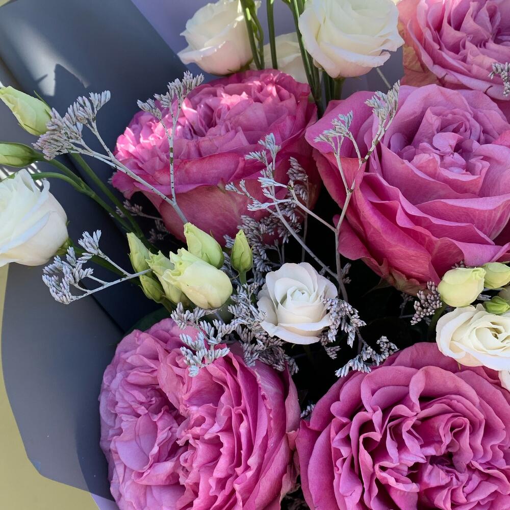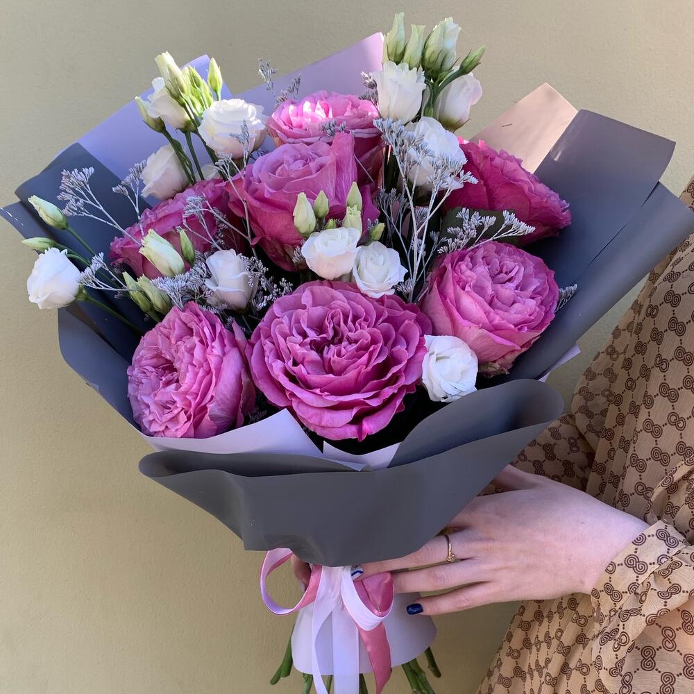 ЯГОДНОЕ МОРОЖЕНОЕ премиум букет с белой эустомой и пионовидными розами