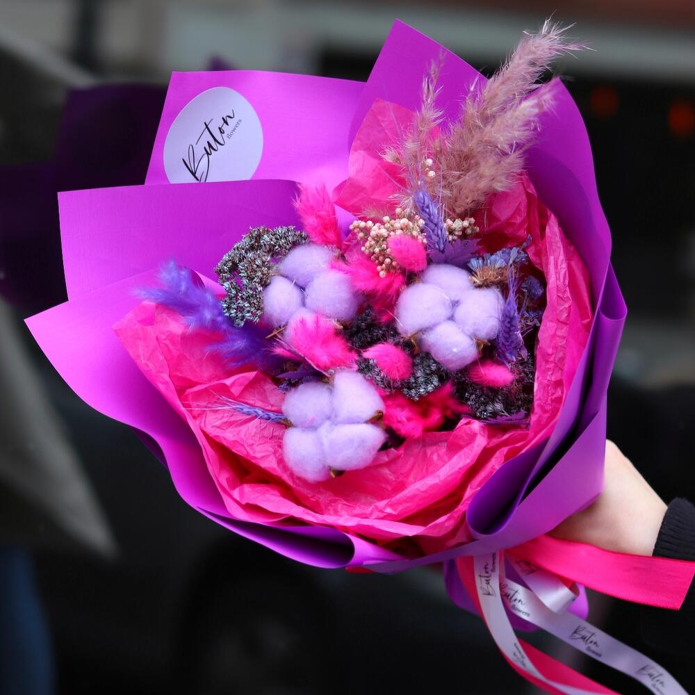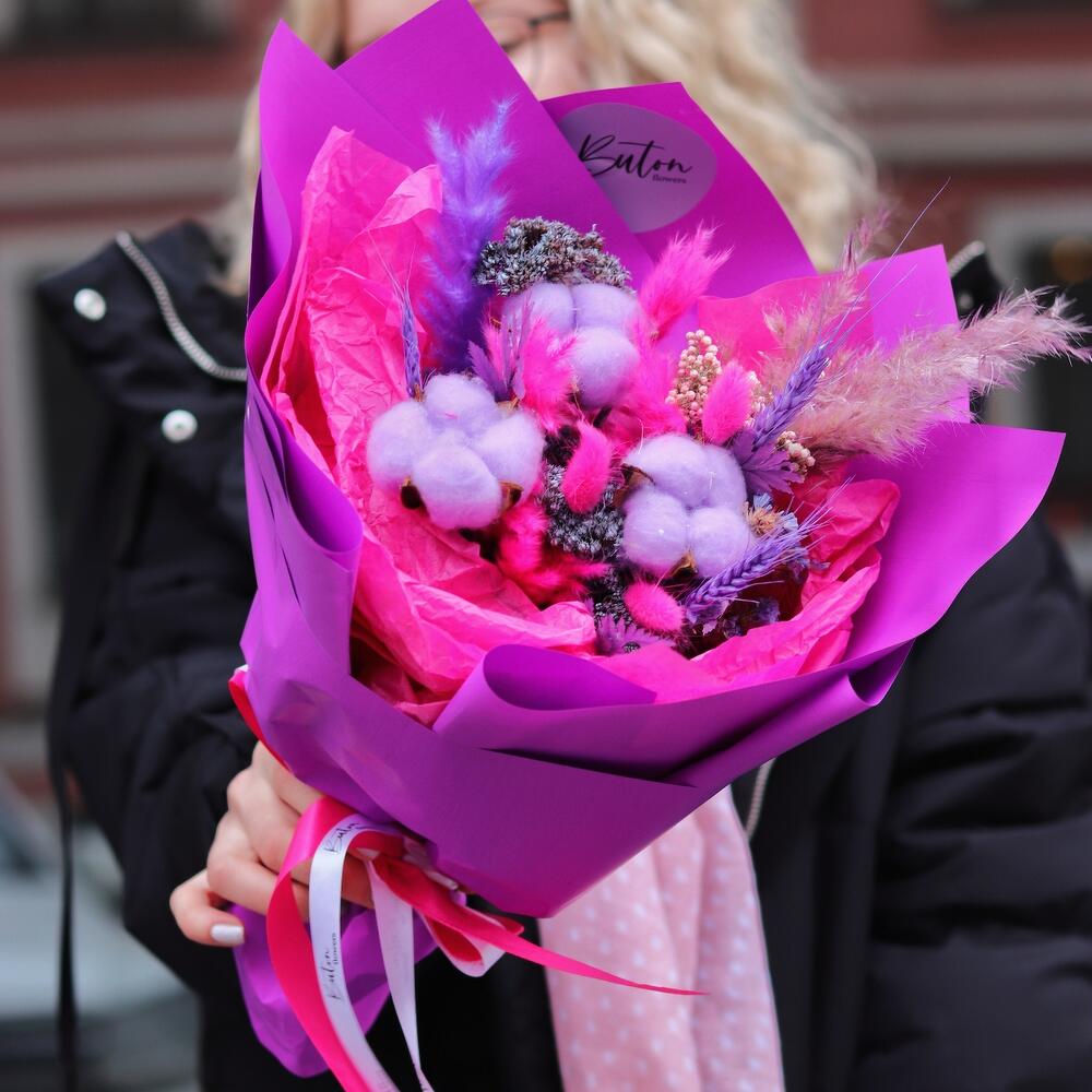 Хлопок – 3 шт.Сетария – 2 шт.Сухоцветы – 10 шт.Папоротник – 2 шт.Дизайнерская упаковка – 1 шт.Открыточка с вашими пожеланиями – 1 шт.Шоколадка – 1 шт.
