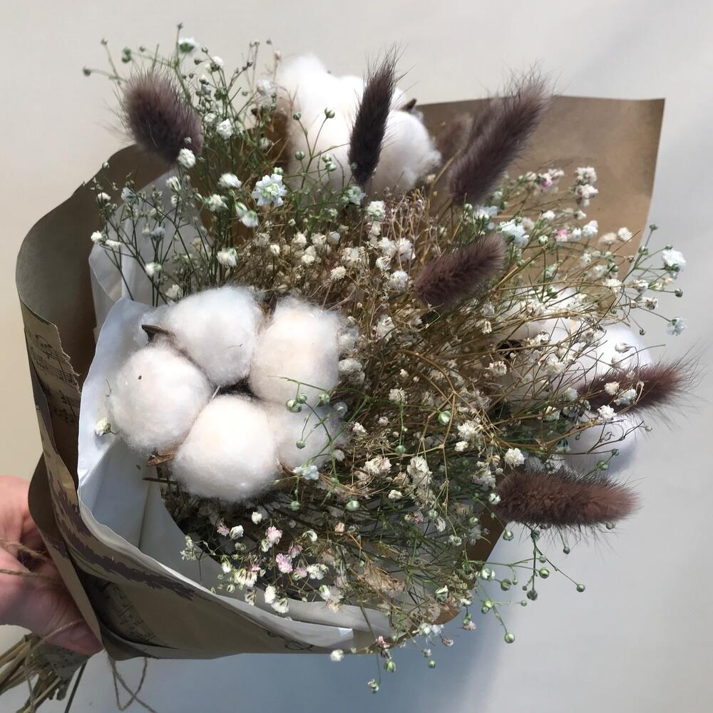 гипсофила сухоцвет – 5 шт.Хлопок натуральный – 3 шт.Лагурус (сухоцвет) – 9 шт.Упаковка дизайнерская – 1 шт.