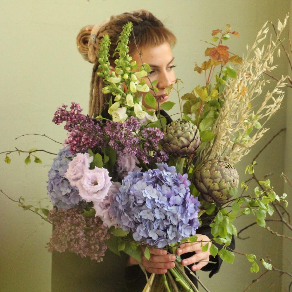 Черничный букет с гортензиями, артишоками, овсом, лизиантусом и наперстянкой.Стильное цветочное решение для любого случая.