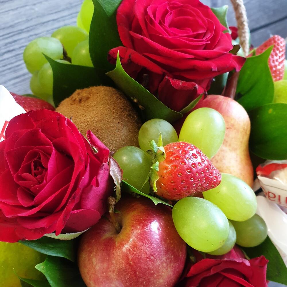 Клубника – 7 шт.Киви – 4 шт.Лайм – 3 шт.конфеты raffaello 150 гр. – 1 шт.розы – 5 шт.яблоки – 3 шт.груши – 3 шт.лагурус ветка – 3 шт.
