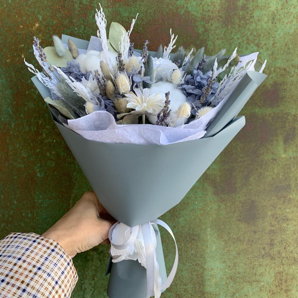 Букет в серо-белой гамме. Немного натурального эвкалипта и лаванды, дают лёгкий аромат. Благородная серая гортензия, хлопок и акцент цветы нигеллы.Букет будет радовать от 2-4 лет.