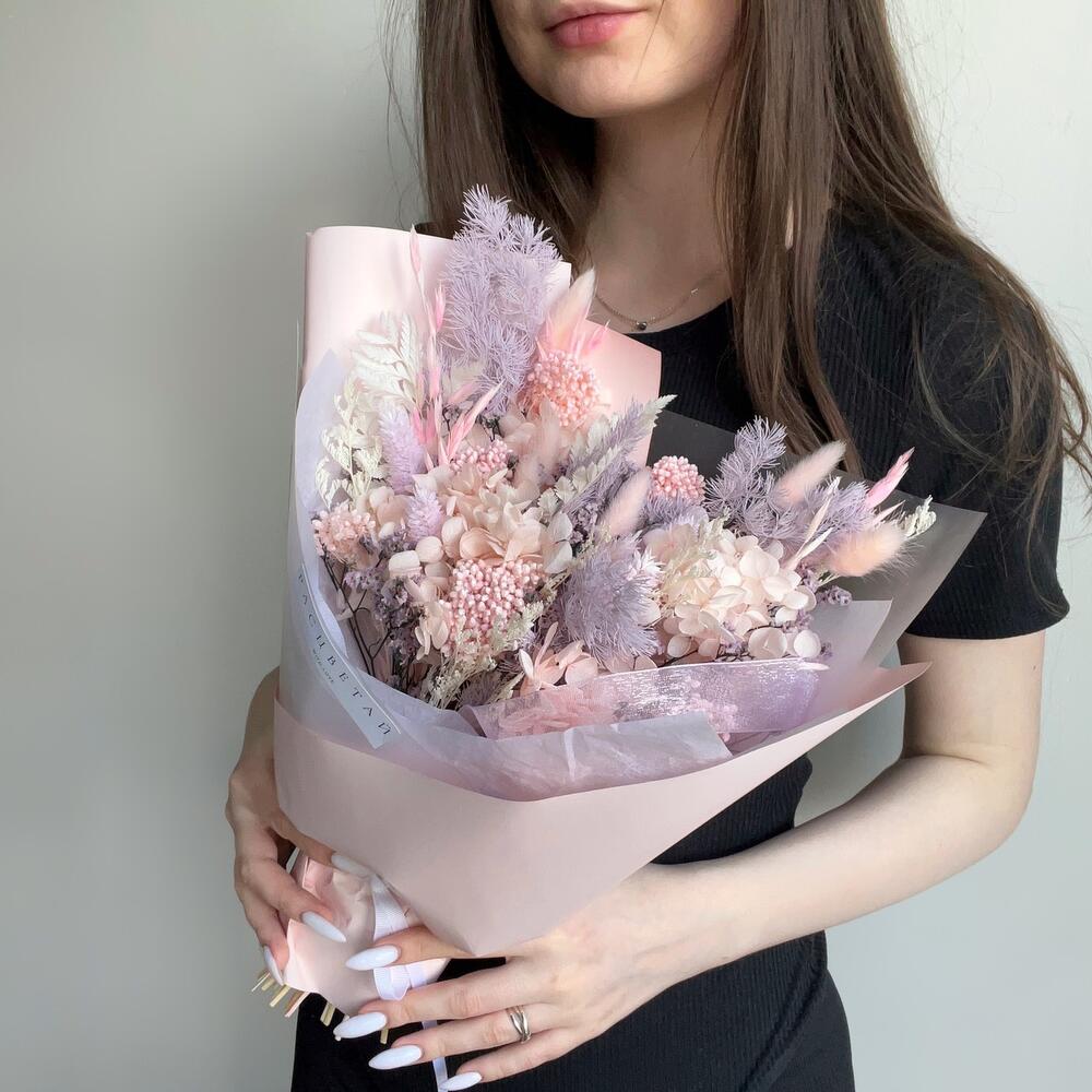 Гортензия – 1 шт.Лимониум – 2 шт.Озотамнус – 1 шт.Аспарагус – 1 шт.Упаковка дизайнерская – 1 шт.Лагурус – 7 шт.Фаларис – 5 шт.Овес – 4 шт.кармек – 2 шт.