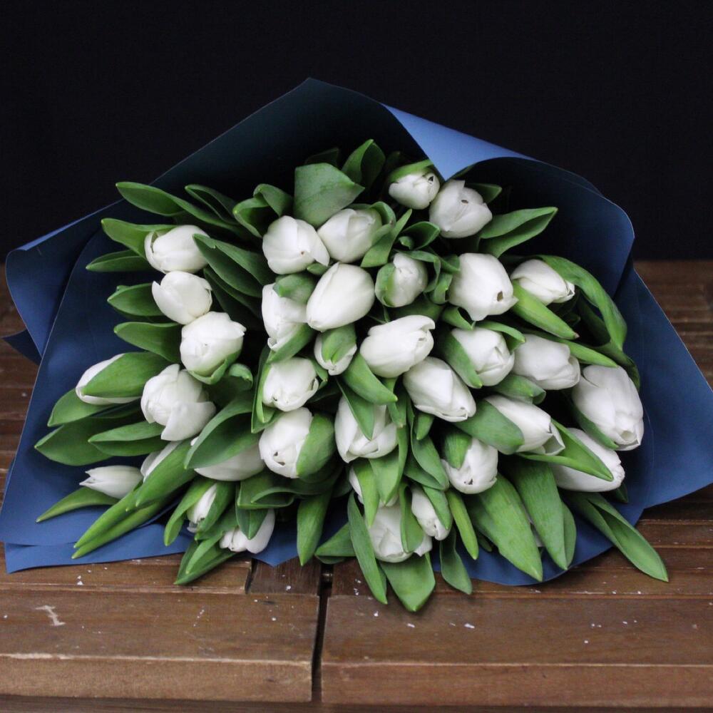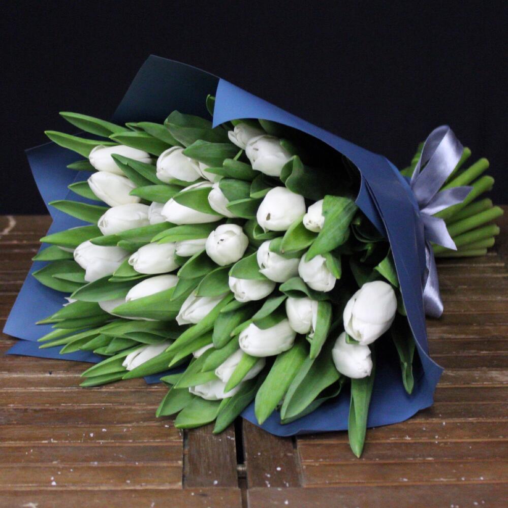 Лента атласная – 1 шт.Тюльпан белый – 35 шт.Пленка матовая – 3 шт.