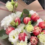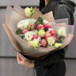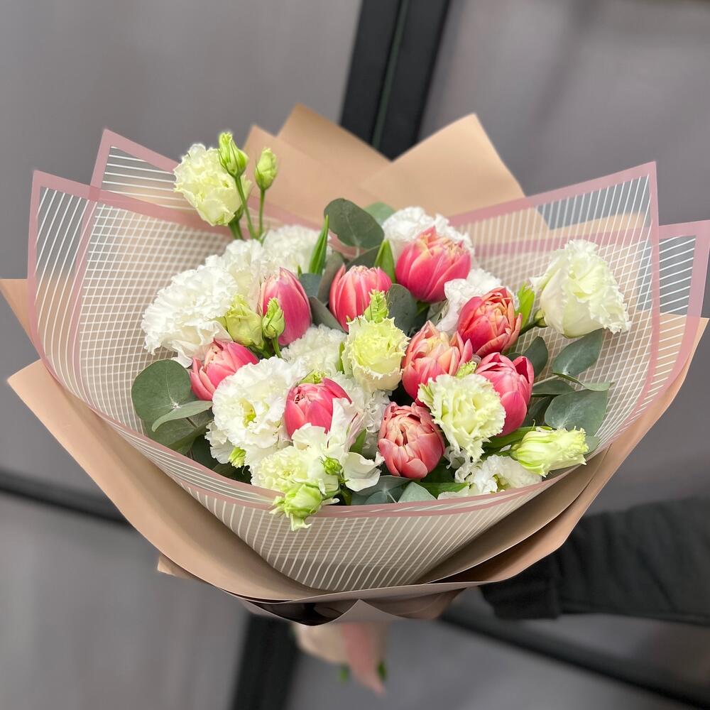 Тюльпан пионовидный – 9 шт.Эустома белая махровая – 3 шт.Эвкалипт – 2 шт.Пленка матовая – 5 шт.Лента атласная – 2 шт.