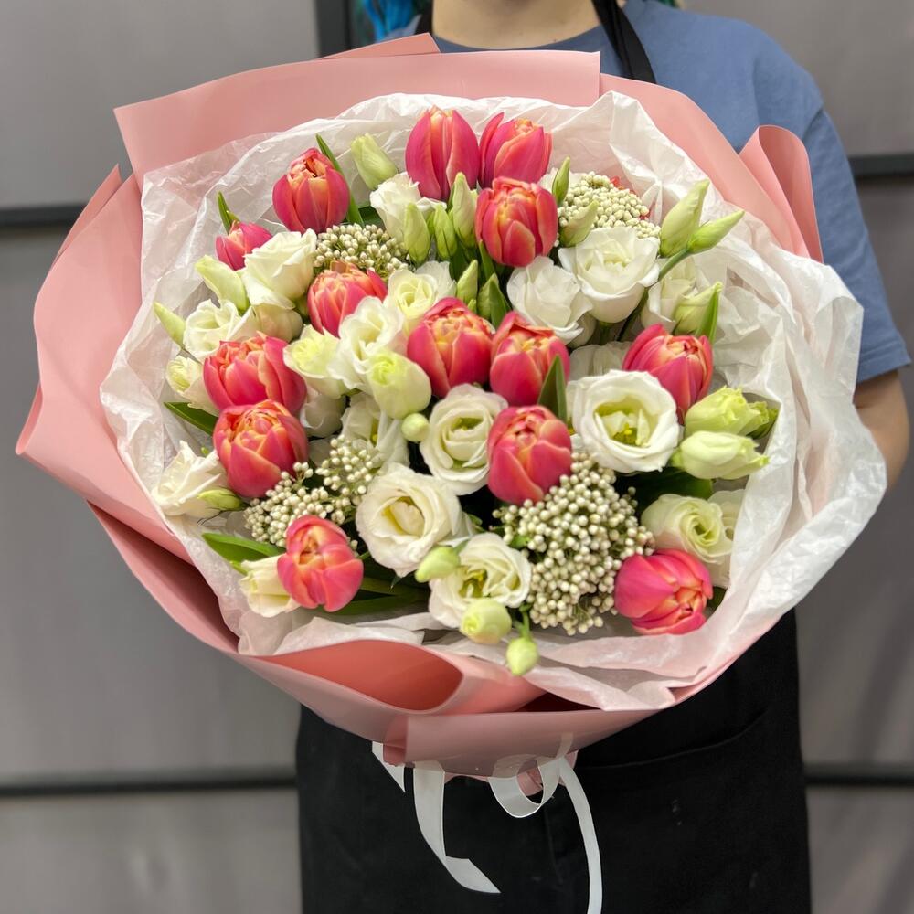 Тюльпан пионовидный – 15 шт.эустома белая – 4 шт.Озотамнус – 4 шт.Тишью – 2 шт.Пленка матовая – 5 шт.Лента атласная – 2 шт.