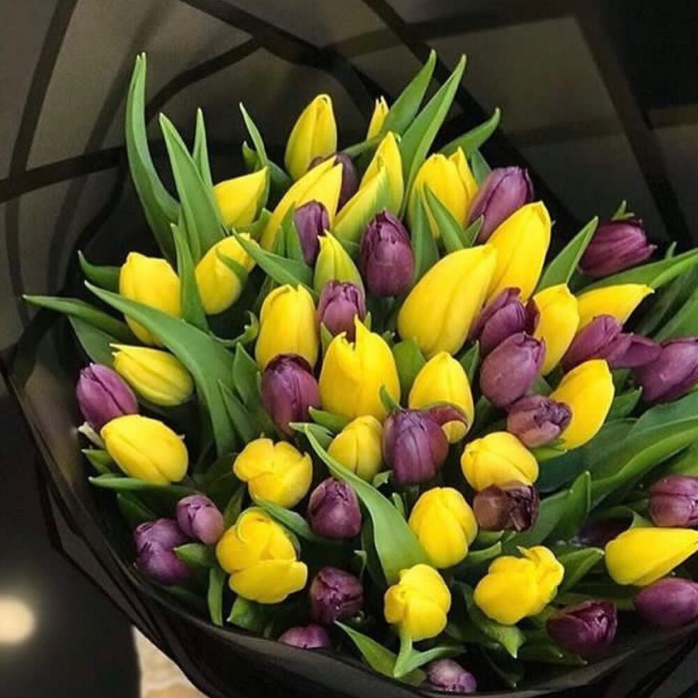 желтые тюльпаны – 26 шт.фиолетовые тюльпаны – 25 шт.Упаковка дизайнерская – 2 шт.Лента атласная – 2 шт.Открытка – 1 шт.инструкция по уходу за цветами – 1 шт.хорошее настроение – 100 шт.коробка переноска – 1 шт.клизал – 1 шт.