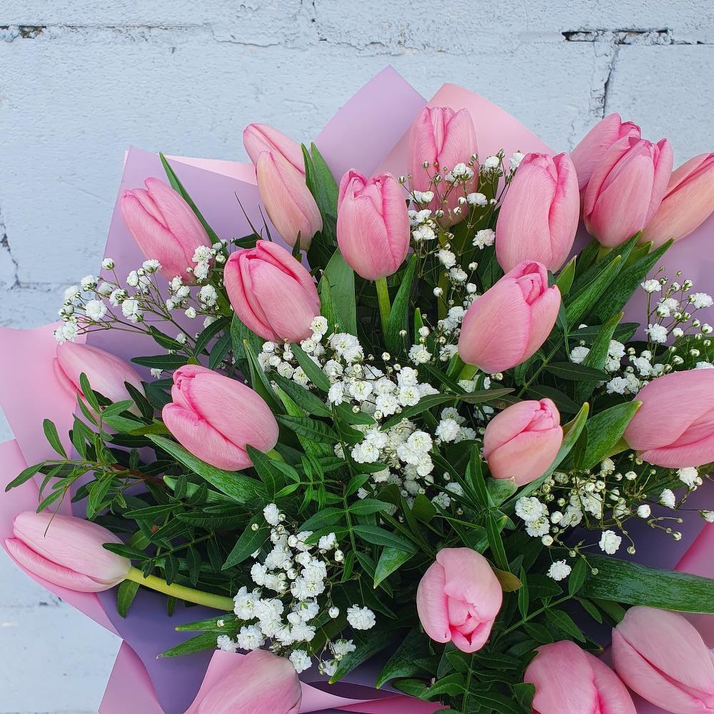 Тюльпан – 21 шт.Гипсофила – 1 шт.Фисташка – 3 шт.Упаковка дизайнерская – 3 шт.